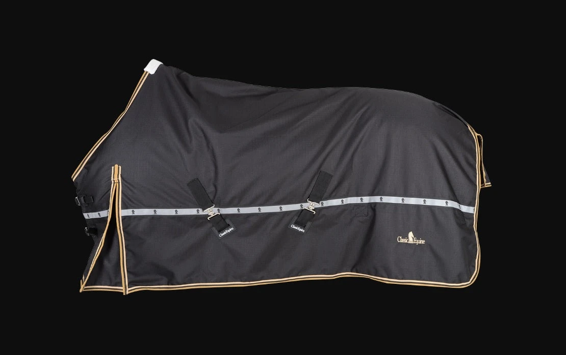 5K Cross Trainer ™ Standard Blanket • 1200 denier breathable ripstop outer shell is waterproof and extremely durable, with a nylon lining that polishes the coat • Ideal for fall, spring or more temperate climates • Designed to protect your horse and withstand winter elements with 100 grams of fi berfi ll insulation • Shaped to naturally contour to the horse’s body • Shoulder gussets allow for freedom of movement • Enhanced tail fl ap and greater length (top to bottom) maximizes protection • Adjustable nylon leg straps are replaceable, to greatly extend blanket life • Crossover adjustable belly straps • Stainless steel snaps and adjustable straps keep the blanket in place with movement • Refl ective Knight Vision ™ safety strip maximizes visibility in low light.