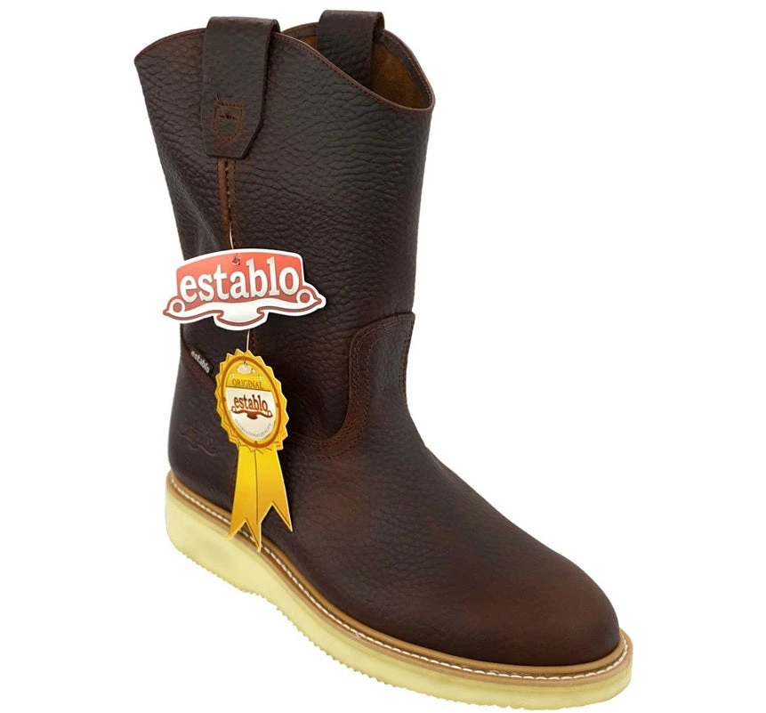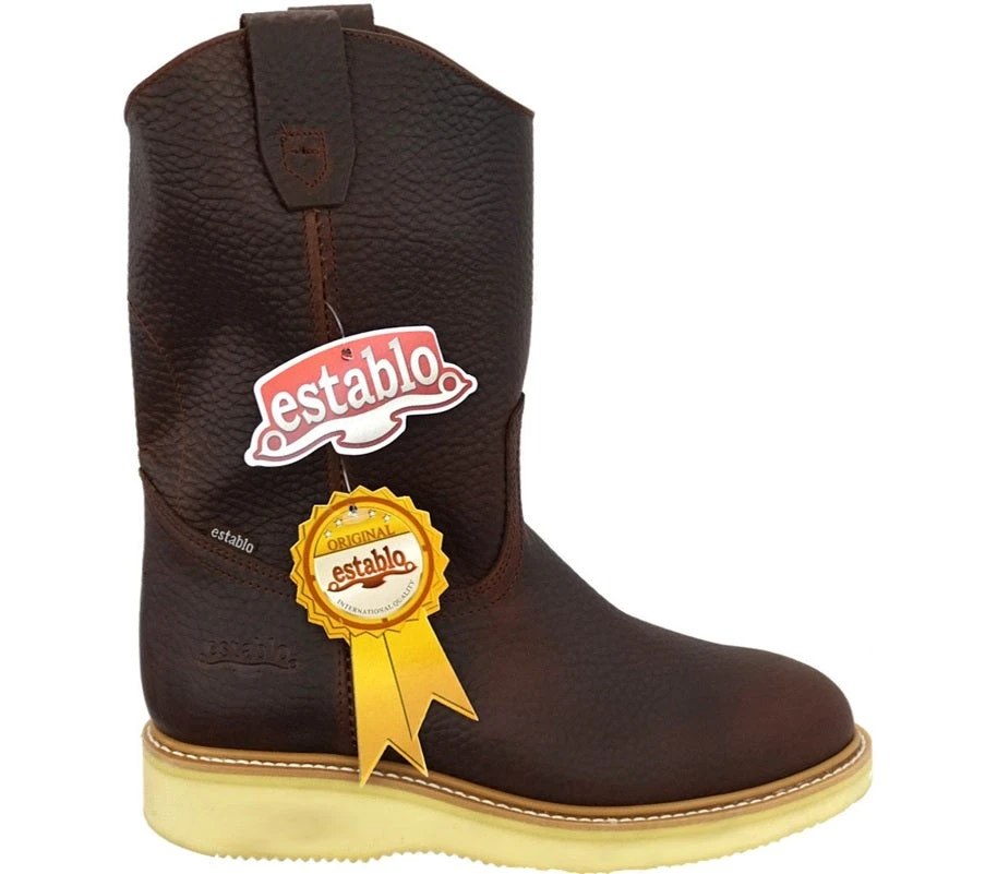 THESE ESTABLO BOOTS HAVE A WEDGE OUTSOLE AND A ROUND TOE PULL ON WORK BOOT. THESE PULL-ON BOOT HAVE A COMFORTABLE WEDGE WITH A MILD TREAD PATTERN. THESE BOOTS DON’T HAVE A HEEL. YOU WILL NEVER MARKS IN FRESH CONCREATE AND PICKING UP MUD OR DIRT. THESE BOOTS HAVE A SOFT TOE AND 10″ HEIGHT.