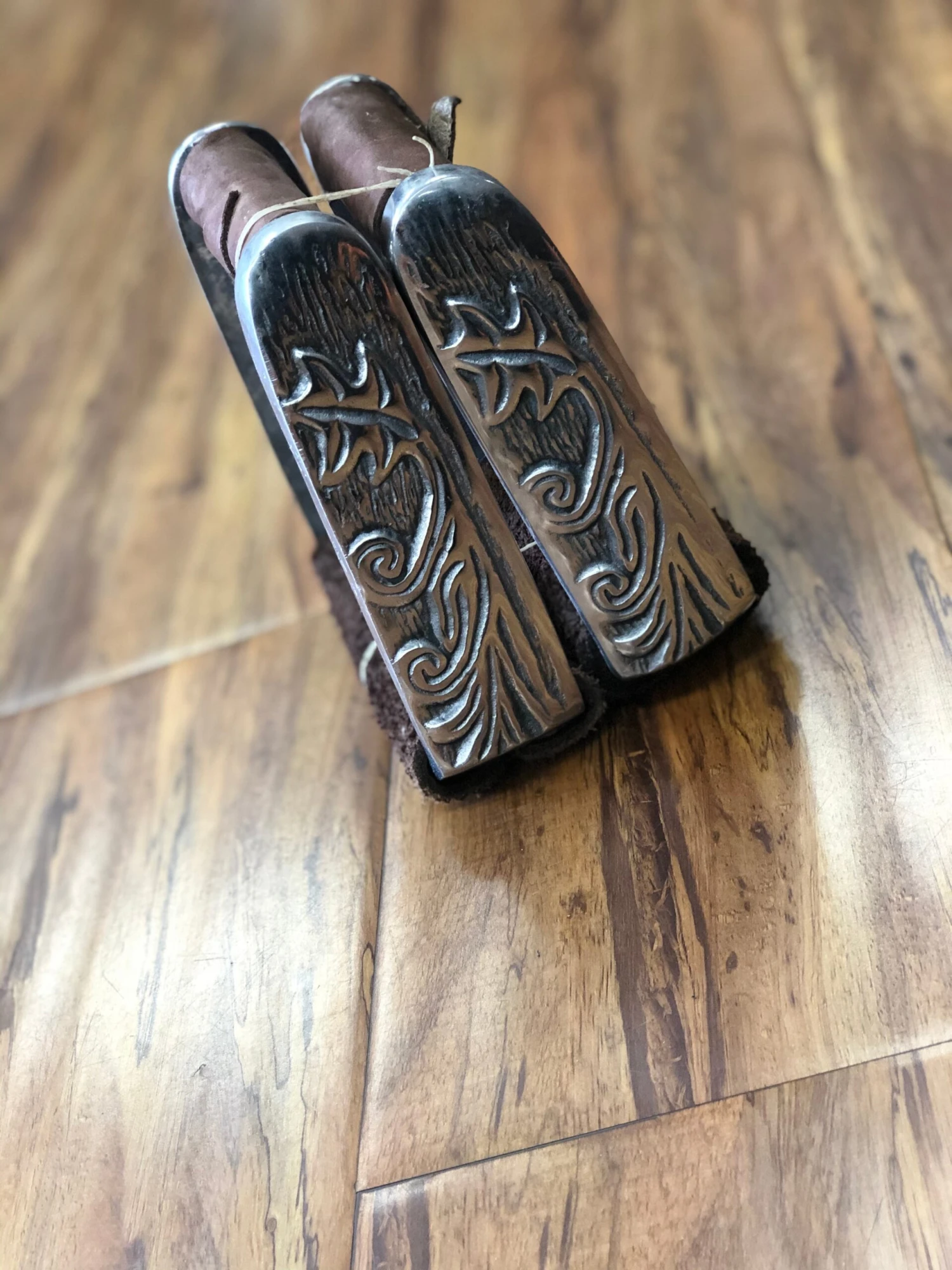 ALUMINUM CHARRO STIRRUPS WITH ART WORK ON THE SIDE.