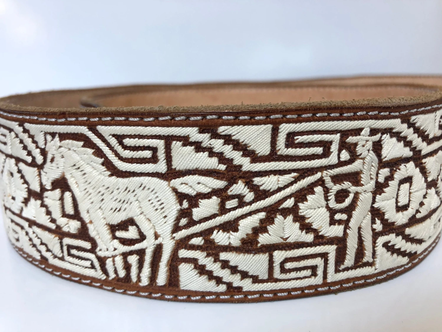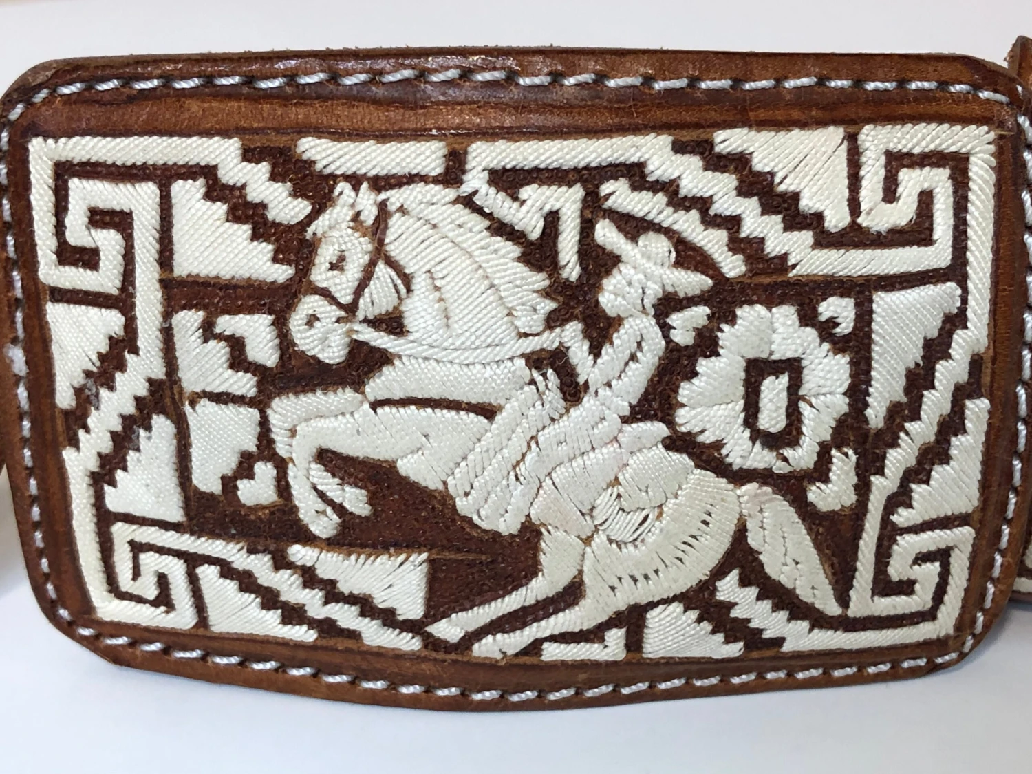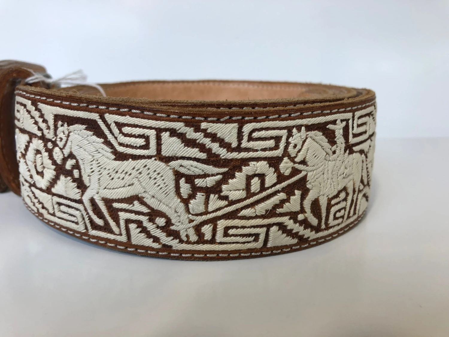 THIS PITA BELT IS DAZZLING LOOKING BELT WITH ALL IT QUALITY COW HIDE LEATHER AND WITH BREATHTALKING CRAFTSMANSHIP. THIS BELT HAS SOME UNIQUE FEATURES WITH THE PITA WORK. IT HAS HORSE AND CHARROS EMBROIDERED ON TO THE BELT. THIS BELT IS 2 INCHES THICK. AND WILL FIT VERY TIGHT ON YOUR JEANS PANTS. ON CHARRO PANTS WILL FIT PERECTLY FINE. THIS BELT WILL COME WITHOUT TAGS.