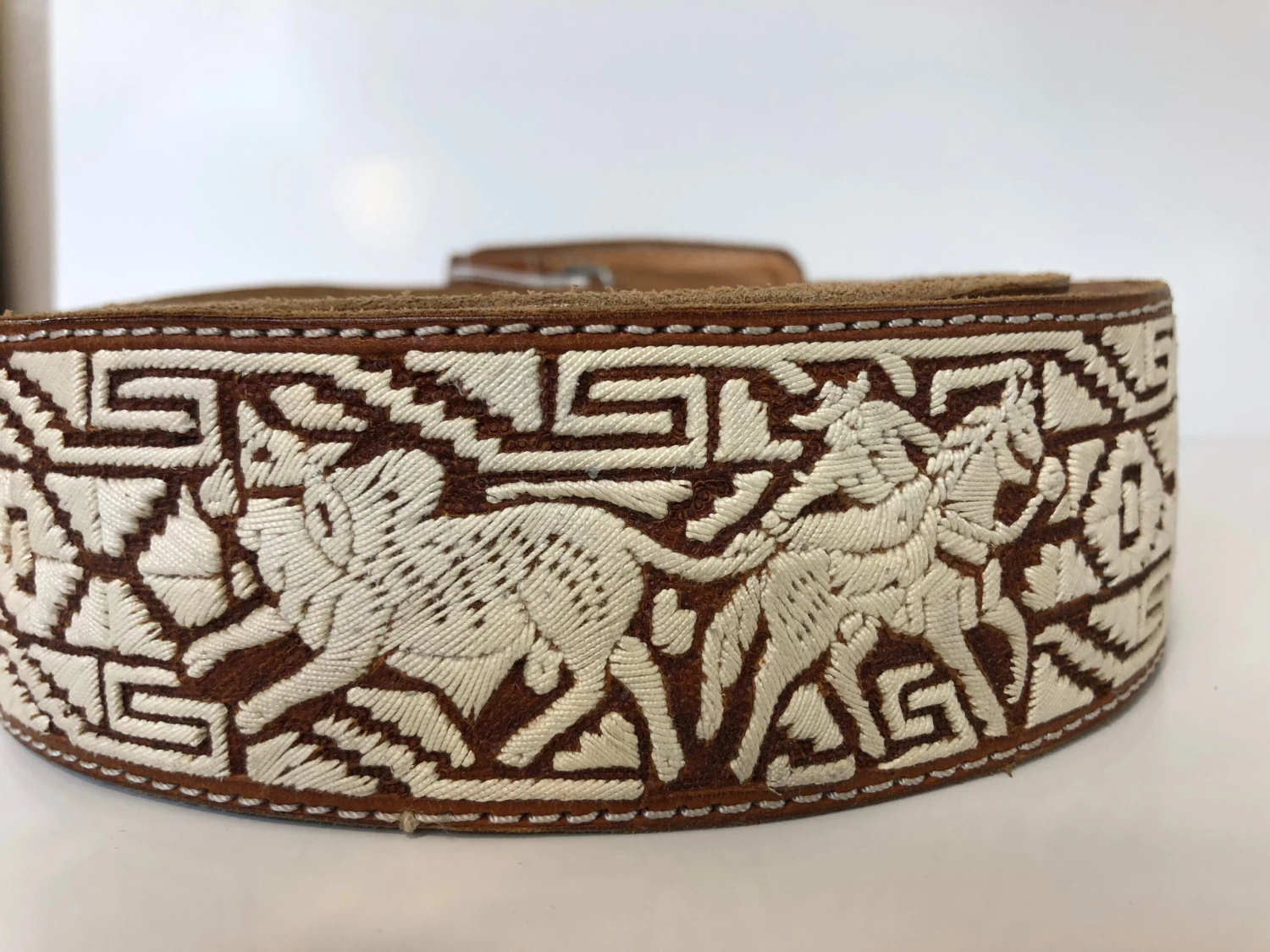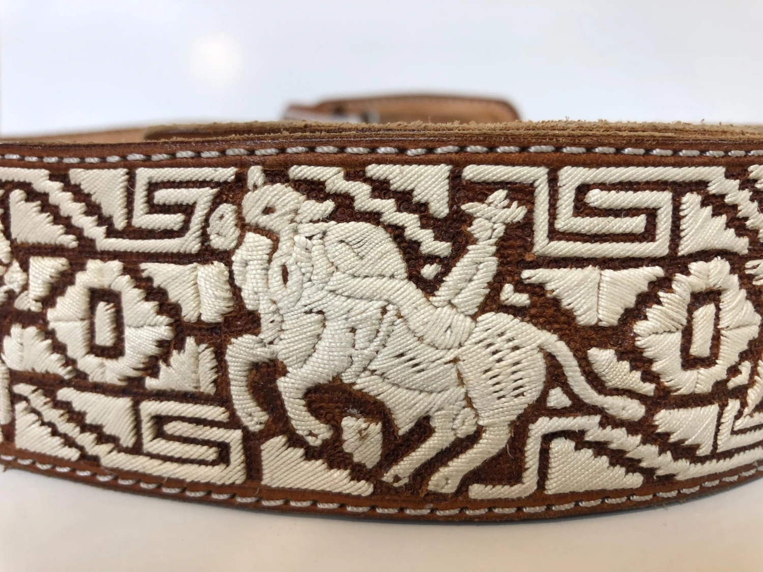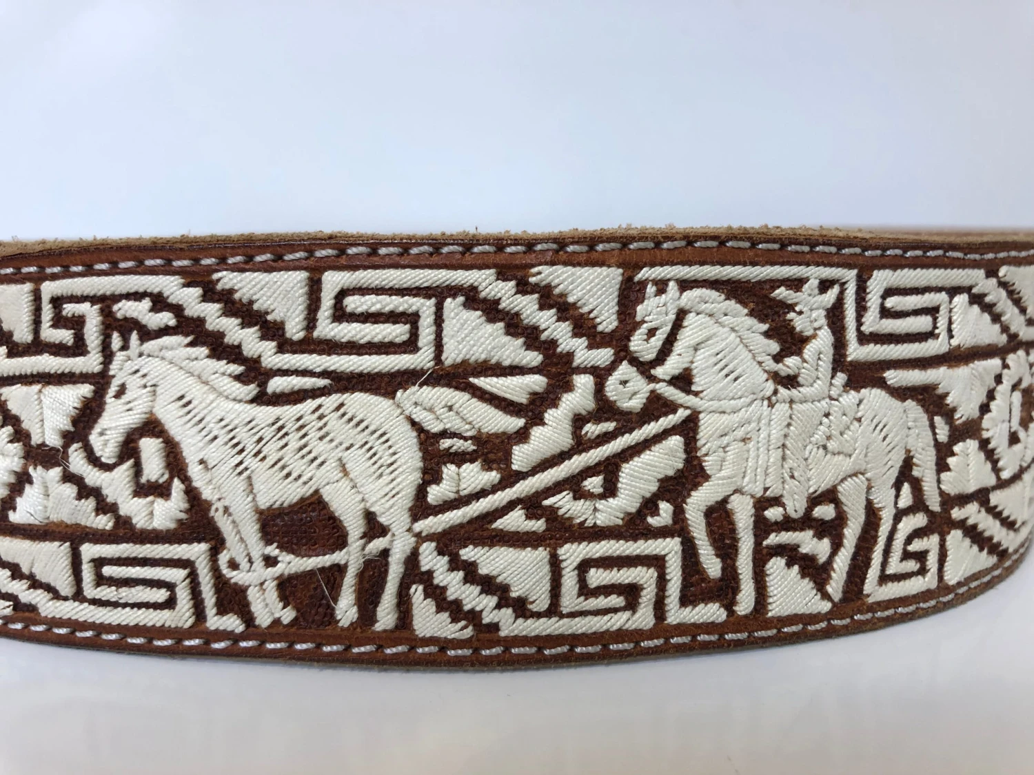 THIS PITA BELT IS DAZZLING LOOKING BELT WITH ALL IT QUALITY COW HIDE LEATHER AND WITH BREATHTALKING CRAFTSMANSHIP. THIS BELT HAS SOME UNIQUE FEATURES WITH THE PITA WORK. IT HAS HORSE AND CHARROS EMBROIDERED ON TO THE BELT. THIS BELT IS 2 INCHES THICK. AND WILL FIT VERY TIGHT ON YOUR JEANS PANTS. ON CHARRO PANTS WILL FIT PERECTLY FINE. THIS BELT WILL COME WITHOUT TAGS.