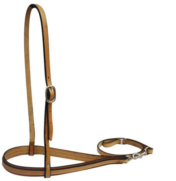 A tan leather 1.5″ nose band with removeable 0.75″ tie down.  Double stitched raised leather noseband with adjustable crown piece and and adjustable tie down. Tiedown attaches to noseband with a bolt snap for easy removal.