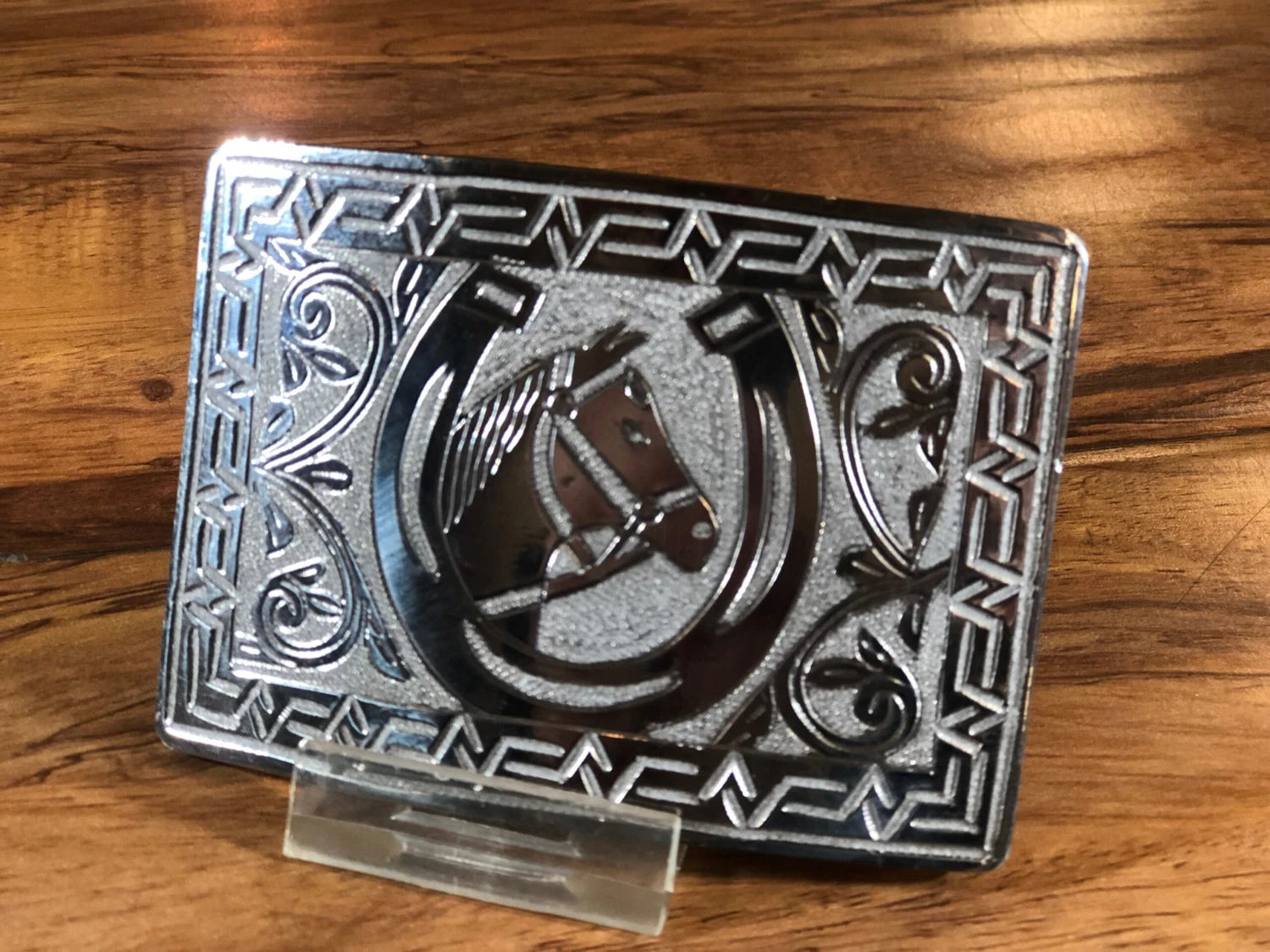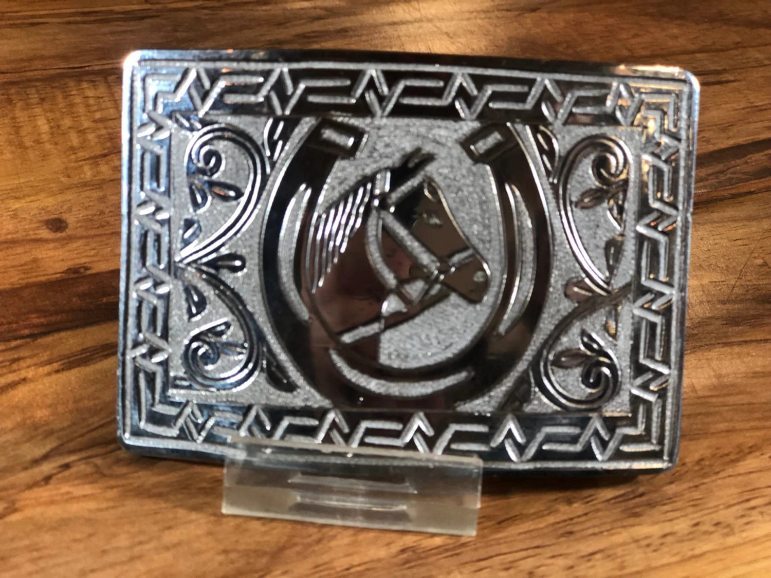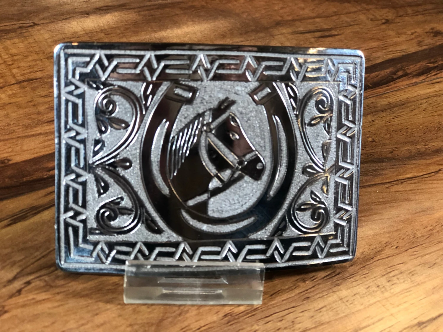 Men’s Engraved Charro Belt Buckle With A Horse And A Horseshoe On It.