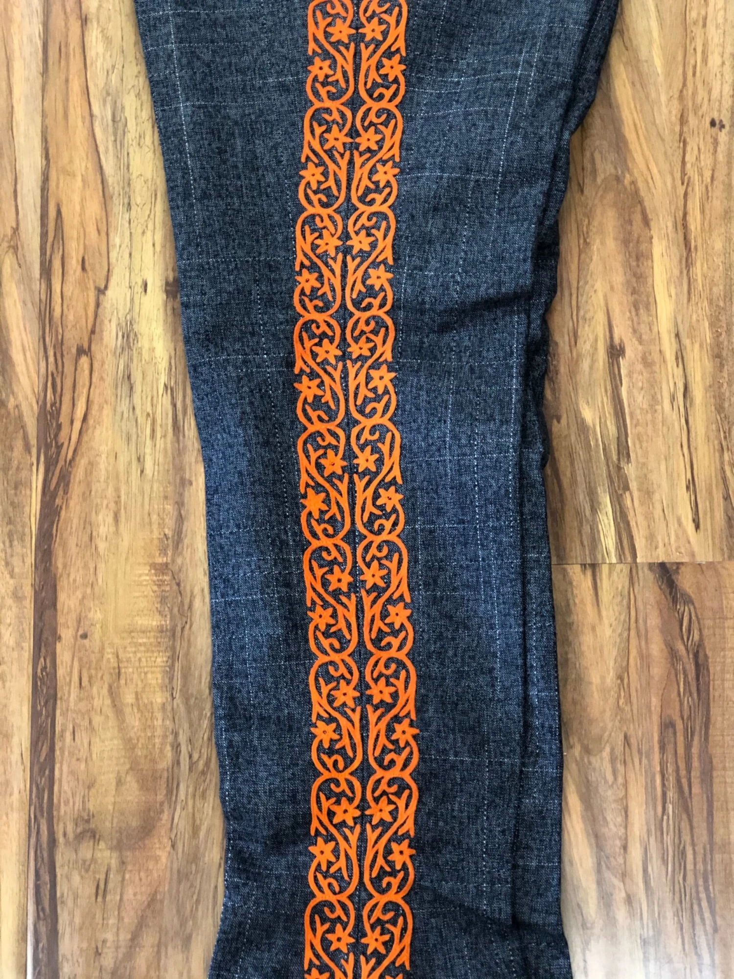 THIS IS A CLASSIC CHARRO PANTS WITH SUEDE LEATHER STITCHED STENCEL WORK WITH A GREEK PATTERN ON THE SIDE.
