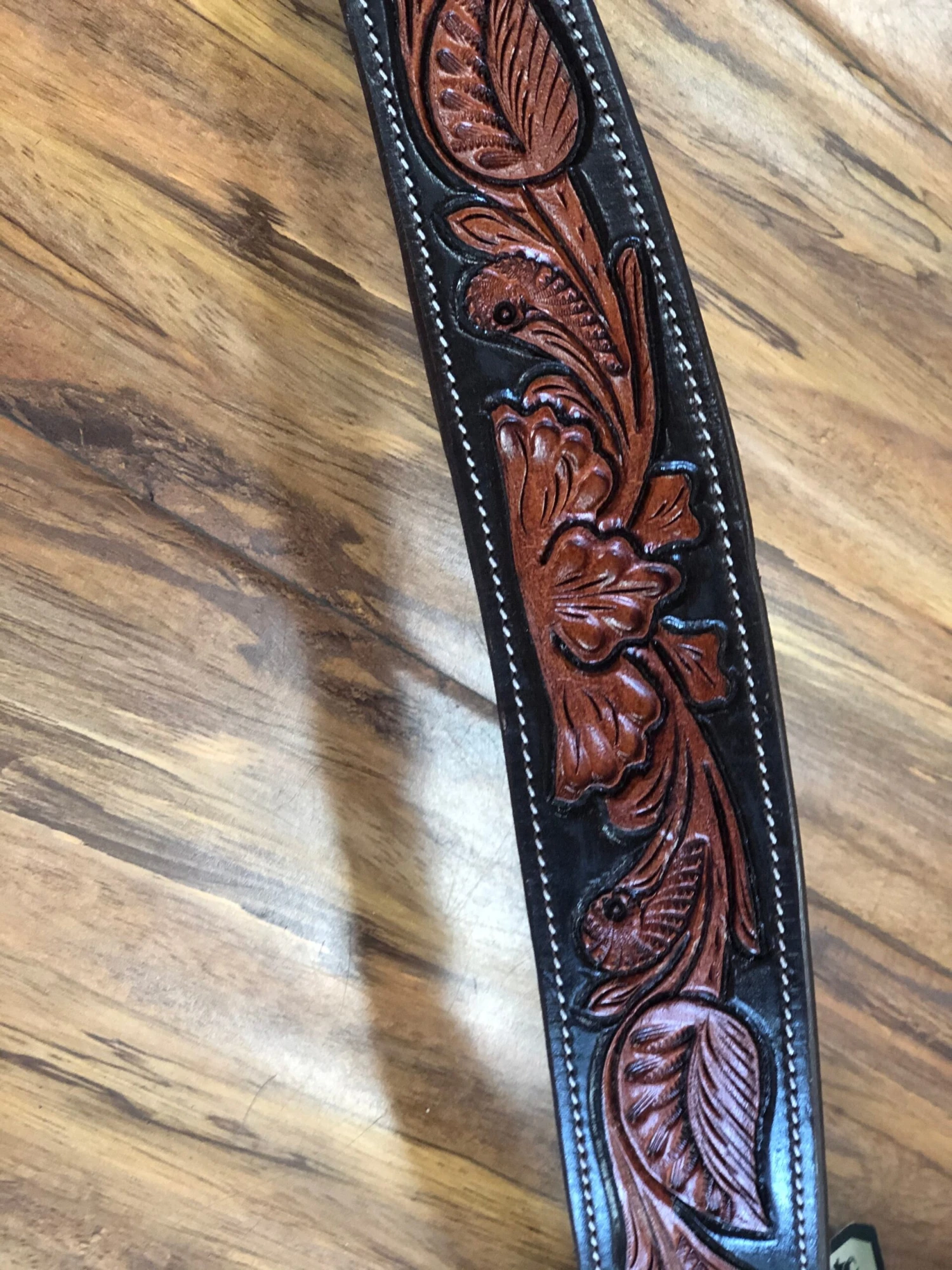Distinctive rich chocolate leather with natural tooling, feature stainless steel hardware.