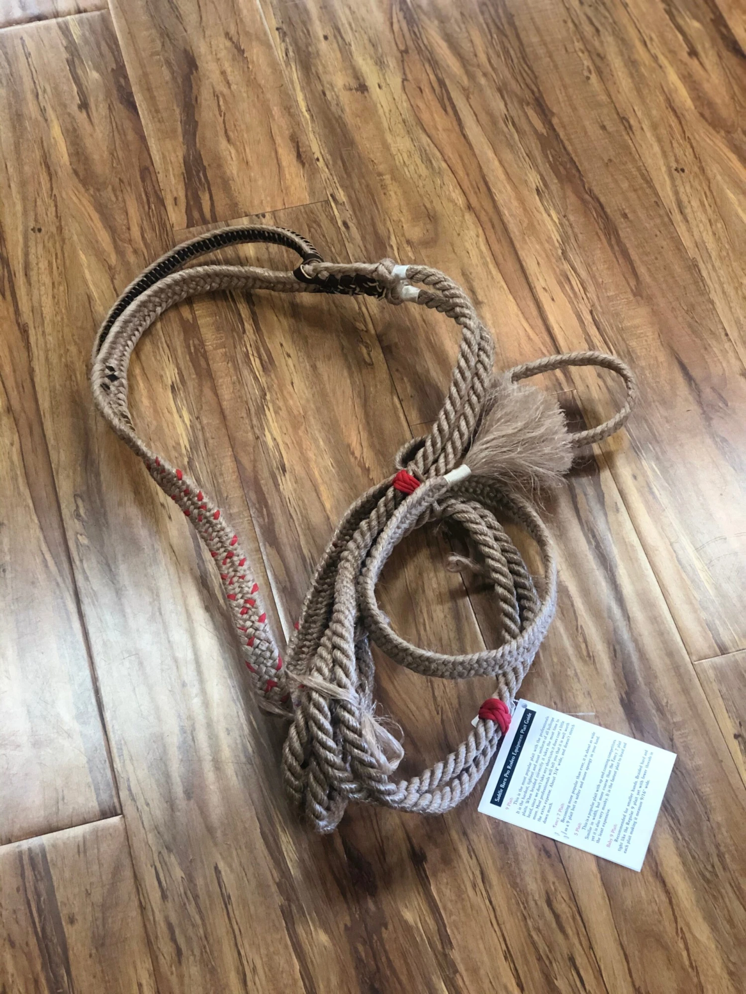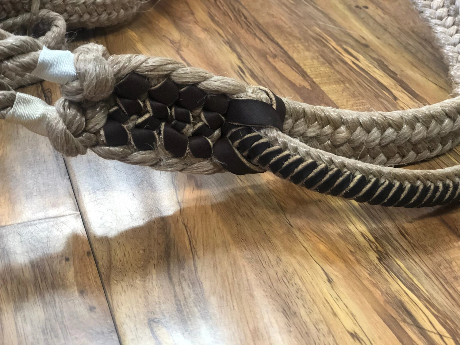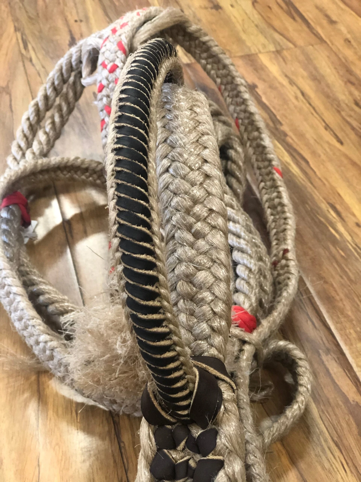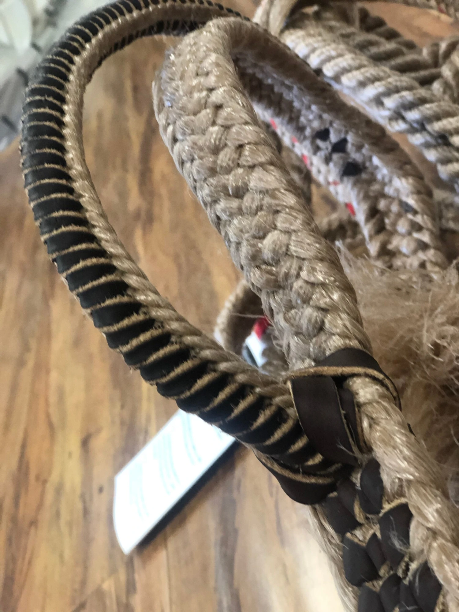 Poly bull rope with full leather laced hand hold. This is a good intermediate rope. comes right or left hands. Sliding nylon keepers