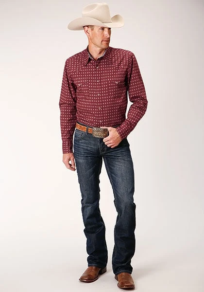 Mens Roper Shirt: Mens Roper Western Shirt. You’ll be ready for a night out in this men’s long sleeve western style shirt from Roper’s West Made Collection. This yarn dyed shirt has an allover texture diamond print with chambray inside trim. One point curved pockets and flaps, a straight back yoke and pearl snap font closures make this shirt look extra sharp. It also features three snap cuffs and is garment washed. 100% Cotton Poplin.Â
