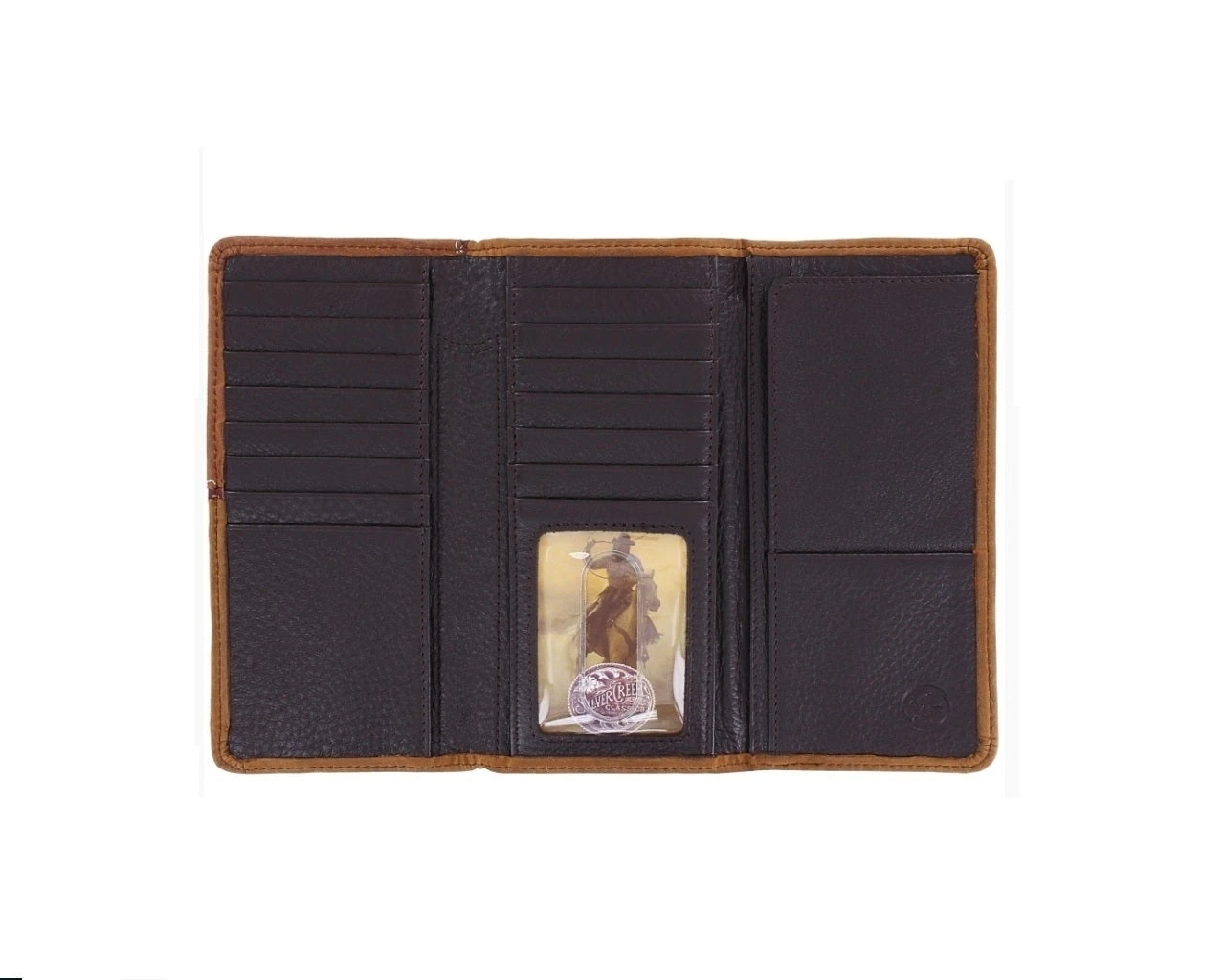 CARRY THIS HANDSOME CHECKBOOK WALLET, WITH A NATIVE AMERICAN MOTIF, AND THE WORLD WILL NOTICE. THE PLATE ORNAMENT RECALLS THE WEST. WHILE ITS PRACTICAL COMPARTMENTS FIT CARDS, A PEN, ID, AND MORE
