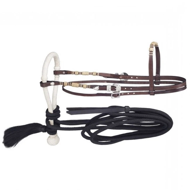 Fine quality 5/8 rawhide core show bosal with 1/2 braided nylon cord mecate rein. Show quality headstall highlighted with bright Inca silver trim. Light oil and dark oil.