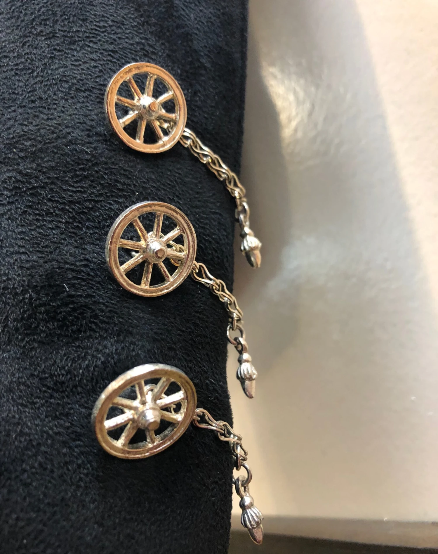 Hardwear is silver in a carriage wheel form.