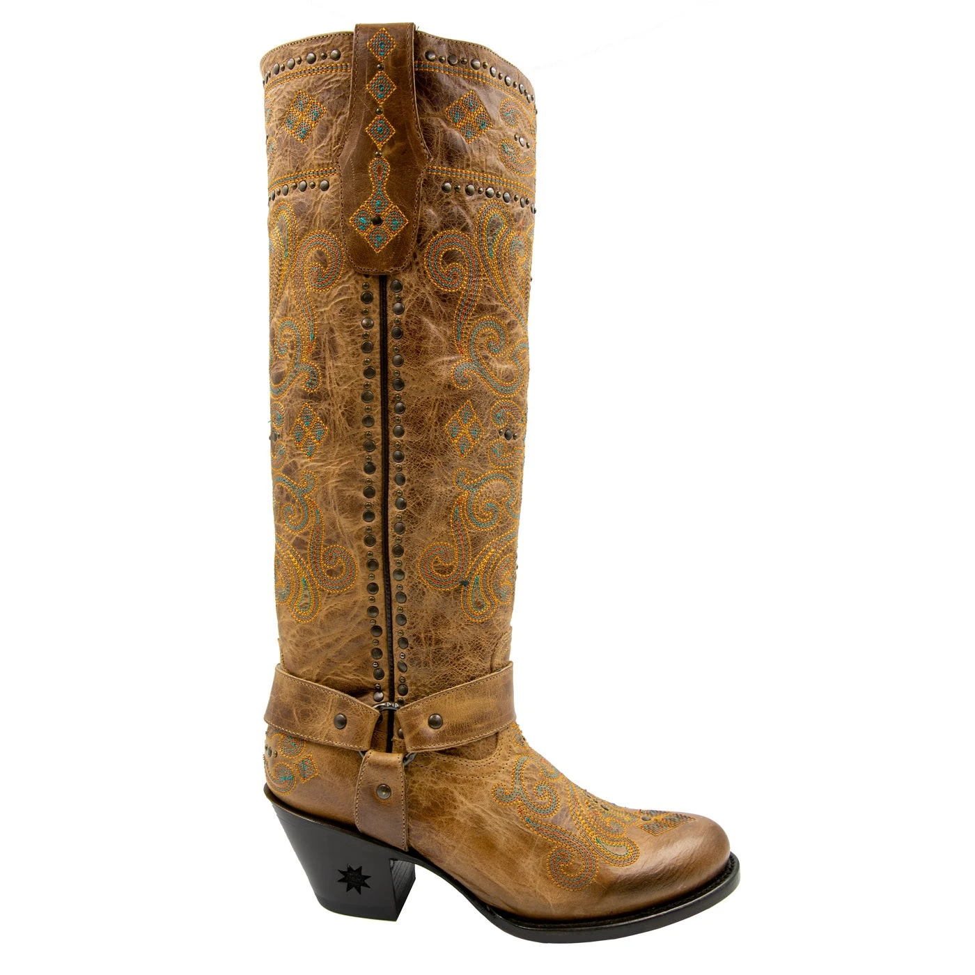 Traditional western styling with a bohemian touch to help you stand out among the stars. The Wimberley encompasses both scrolled and geometrical embroidery with hardware and studs that complements the contrasting colors of the stitching. This boot features a flattering 16″ shaft height, riding heel, and a round toe. The cushioned footbed and soft leather lining provide cloud-like comfort for all day wear.